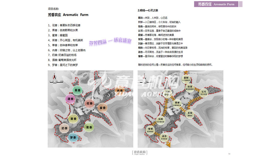 我们在创意讨论中联想到欧洲庄园及世界名画中的各类庄园贵族生活场景,因此思考能否在此处营造一个农庄生活,心灵牧场,让都市人远离尘嚣,在此处寻找一种人性的解放。因此我们在定位上提出“让心灵放牧,在芳香的梦境”,规划布局了芳香郡( 花海)、向日葵牧场 、蜜蝶谷 、绿点心菜园 、芳香庄园、香颂酒庄等项目,得到了甲方的高度认可。